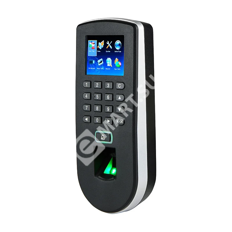 ZKTeco F19 - Биометрический терминал для идентификации по отпечаткам пальцев. Дисплей цветной 2.4" TFT. Опционально считыватель RFID карт EM/MF.Интерфейсы: TCP/IP, RS232\RS485, USB Хост. Память шаблонов отпечатка пальца 3000. Память журнала событий 100 000 Входы\выходы: дверной звонок, дверной датчик, «тревожный» выход, кнопка выхода, звонок, Wiegand вход\выход, AUX.