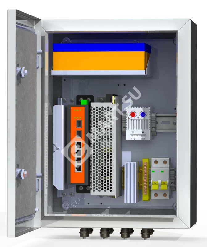 Двухполюсный защитный автомат 6А - 1 шт. Обогреватель 50Вт - 1 шт. Сдвоенный термостат - 1 шт. Блок бесперебойного питания 155Вт -1 шт. Аккумулятор 12В, 2,2А/ч - 4 шт. Промышленный неуправляемый коммутатор 4*PoE 802.3 af/at (бюджет 140 Вт), 2*SFP - 1 шт. Оптический кросс 4 порта SC/SM - 1 шт. Гермовводы 4*PG9, 4*PG13,5 -1 комплект. Устройство грозозащиты линии 220В -1 шт.