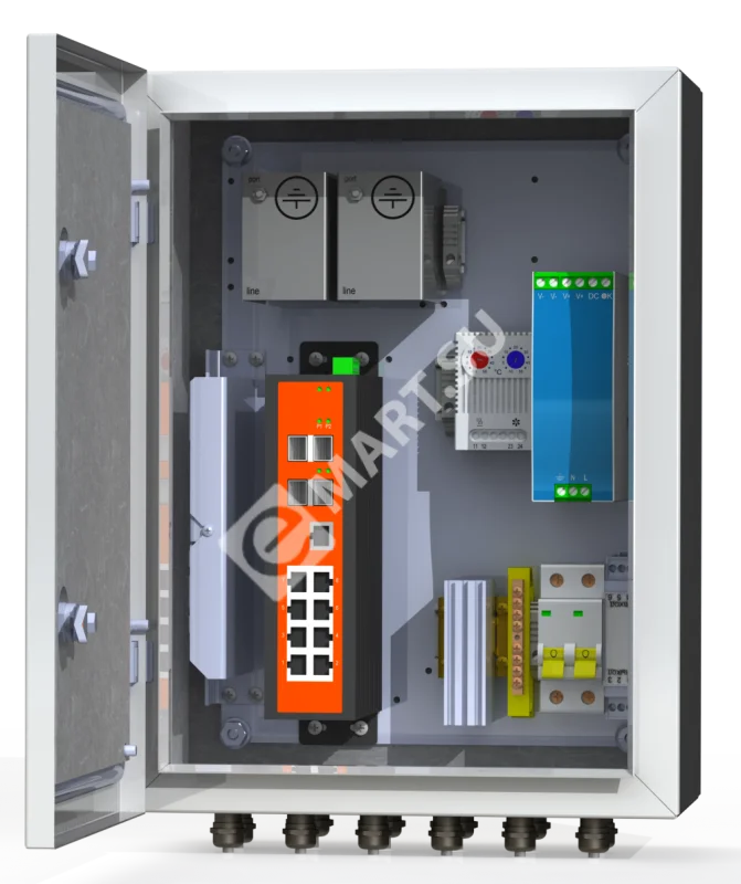 Двухполюсный защитный автомат 6А - 1 шт.Обогреватель 50Вт - 1 шт. Сдвоенный термостат - 1 шт. Блок питания 240Вт -1 шт. Промышленный управляемый коммутатор 8*PoE 802.3 af/at (бюджет 230 Вт), 4*SFP, 1*console port - 1 шт. Оптический кросс 4 порта SC/SM - 1 шт. Устройство грозозащиты линии 220В -1 шт. Устройство грозозащиты линий PoE -2 шт. Гермовводы 8*PG9, 4*PG13,5 -1 комплект.