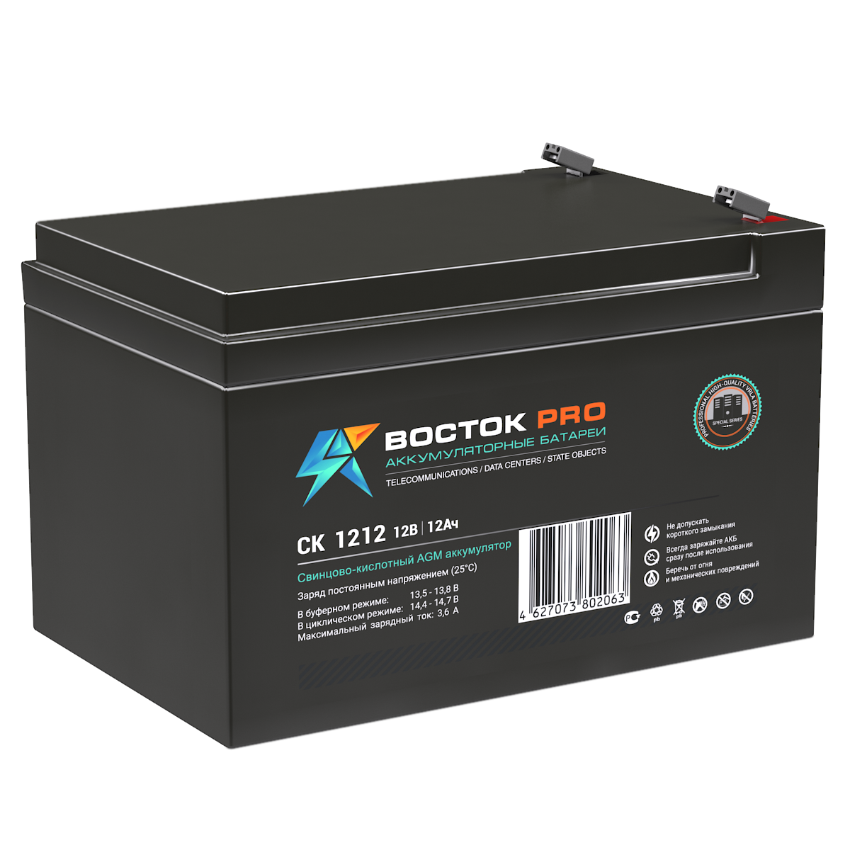 Свинцово-кислотные аккумуляторы ВОСТОК серии CK предназначены для использования в системах бесперебойного питания, резервного энергоснабжения, автономных энергосистемах. Изготовлены по AGM технологии (электролит, абсорбированный в стекловолоконном сепараторе), являются герметизированными и необслуживаемыми, со сроком службы в буферном режиме 10 лет (от 5 до 26 Ач – 5 лет). Обладают высокими разрядными и эксплуатационными характеристиками благодаря использованию в составе электролита и намазной пасты специальных добавок, препятствующих коррозии и замедляющих процесс старения.