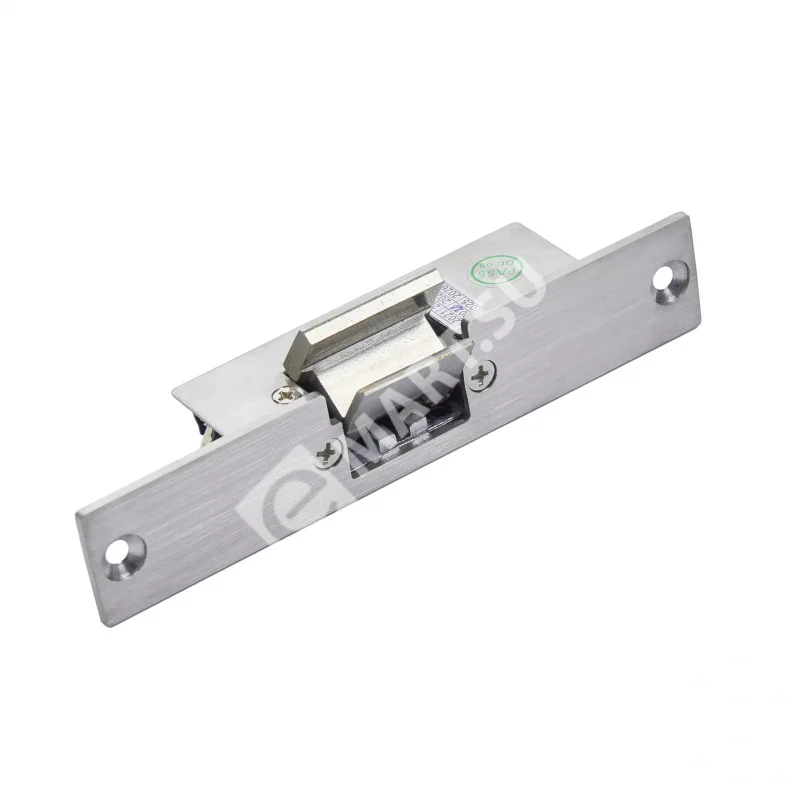 Электромеханическая защелка ZKTeco AL-133NC с планкой в комплекте (без питания ригель разблокирован). Устанавливается на стеклянные двери. В исходном состоянии открыта, при подаче напряжения блокируется. Врезается в дверной косяк и с помощью контропоры осуществляет блокировку стеклянного дверного полотна. Рабочее напряжение: DC 12В, рабочий ток: 120 мА, сила удержания: 250 кг, вес: 0.37 кг, размер блокирующей части: 29х13х11 мм.