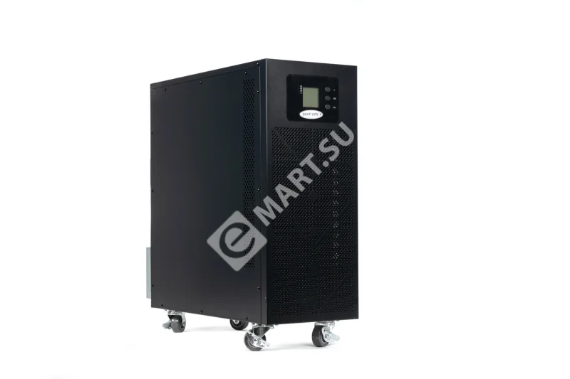 380 В, 10 кВА (9 кВт), Online, 3-фазный вход–3-фазный выход, синусоидальная форма выходного напряжения, длительный резерв, световая и звуковая индикация режимов работы, ЖК-дисплей, необходимое кол-во АКБ для работы — 16/18/20 шт., горячая замена АКБ, холодный старт, ёмкость — от 40 Ач. Ток заряда АКБ — 14 А, стабилизация выходной частоты 50 Гц при входной 40–70 Гц. Наращивание мощности или резервирования параллельным включением до 4 устройств. Дистанционный мониторинг по RS 232, USB, коммуникационный порт типа "сухой контакт". Функция удалённого аварийного отключения выходного напряжения (EPO). Напольная установка. Уникальный ИБП для длительного резерва всего объекта. Время автономной работы зависит только от ёмкости АКБ. Возможность подключения SNMP-модулей CY 504 и DA 806.