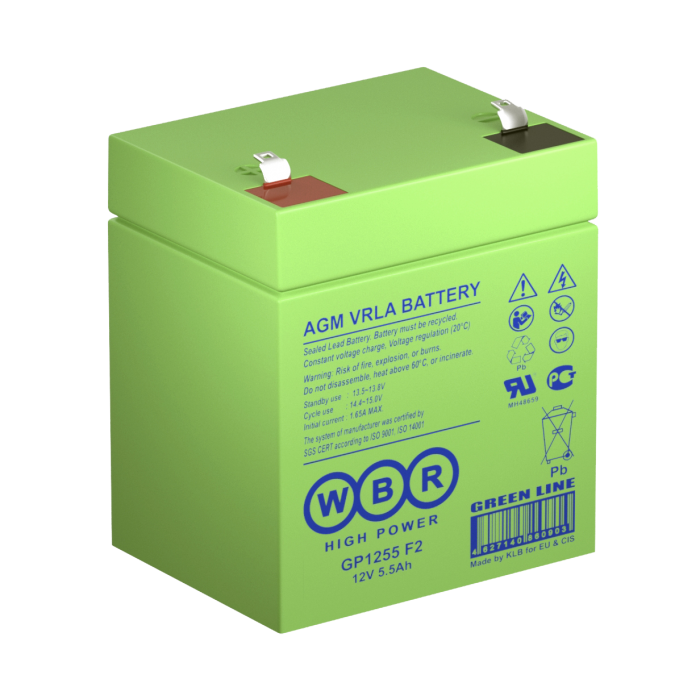 Аккумулятор WBR GP1255 F2 - герметизированная, выполненная по технологии AGM, батарея общего применения со сроком службы до 8 лет в буферном режиме или 260 циклов заряда-разряда в циклическом режиме при 100% разряде. Эта высокоэффективная, перезаряжаемая батарея, не требующая обслуживания в течение всего срока службы.