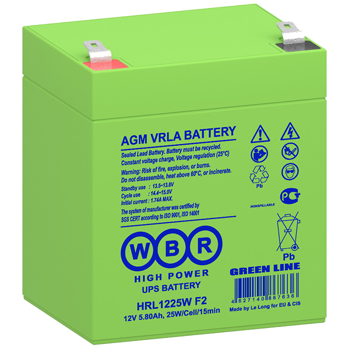 WBR серии HRL1225W F2 - герметизированные, необслуживаемые, VRLA аккумуляторы, изготовленные по технологии AGM, со сроком службы до 12 лет применяются для эксплуатации на коротких режимах разряда в системах бесперебойного питания ЦОД и другом технологическом оборудовании. Допускают до 300 циклов глубокого разряда.