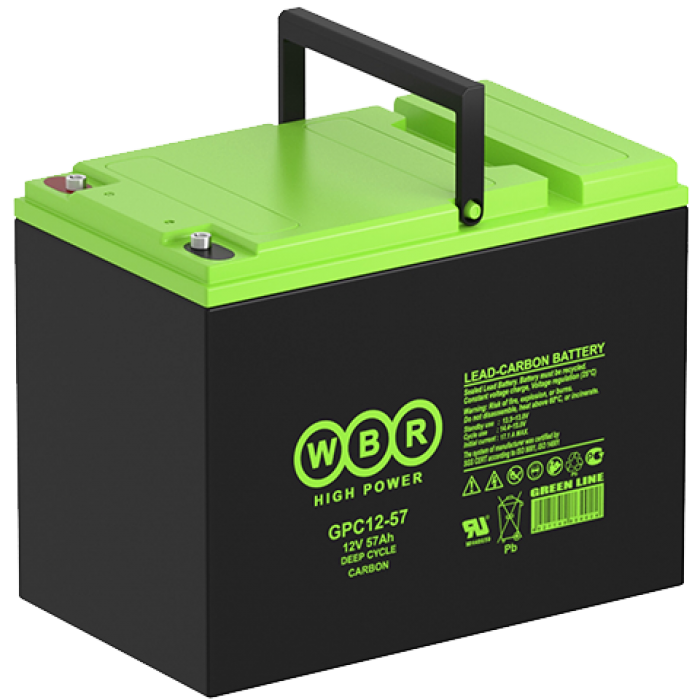 Аккумулятор WBR GPC12-57 - герметизированная, карбоновая, свинцово кислотная, аккумуляторная батарея со сроком службы 15 лет или более 1900 расчетных циклов заряда-разряда в циклическом режиме при 70% разряде. Эта высокоэффективная, перезаряжаемая батарея не требует обслуживания в течение всего срока службы и за счет использования чистого свинца, а также добавки углерода в состав электродов получили улучшенные зарядные и разрядные характеристики.