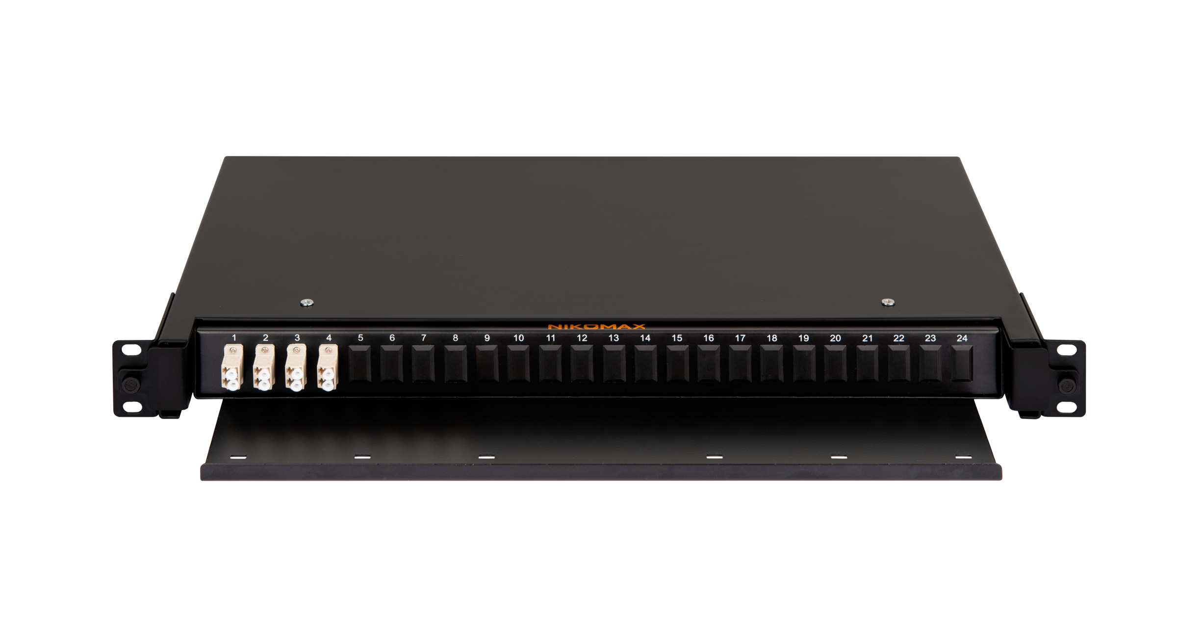 Оптический кросс NIKOMAX 19" Premium Line, 1U, укомплектованный на 8 портов LC/UPC (4 двойных LC/UPC адаптера), MM 50/125 OM2, выдвижной, с полкой, черный, в комплекте: адаптеры, монтажные шнуры 1м, сплайс-кассета с крышкой, гильзы, заглушки